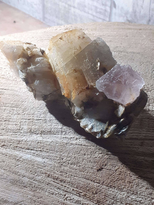 Beautiful pink fluorite crystal on cluster of mica and quartz, well shaped, well balanced, 135 grams
