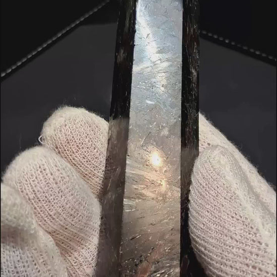 A rare titanium silicate prized for its striking starburst formations and metallic shimmer. This 125 mm astrophyllite tower features unique natural patterns and is valued by collectors and spiritual practitioners alike for its beauty and reputed connection to intuition and higher consciousness. An impressive display piece for any collection.