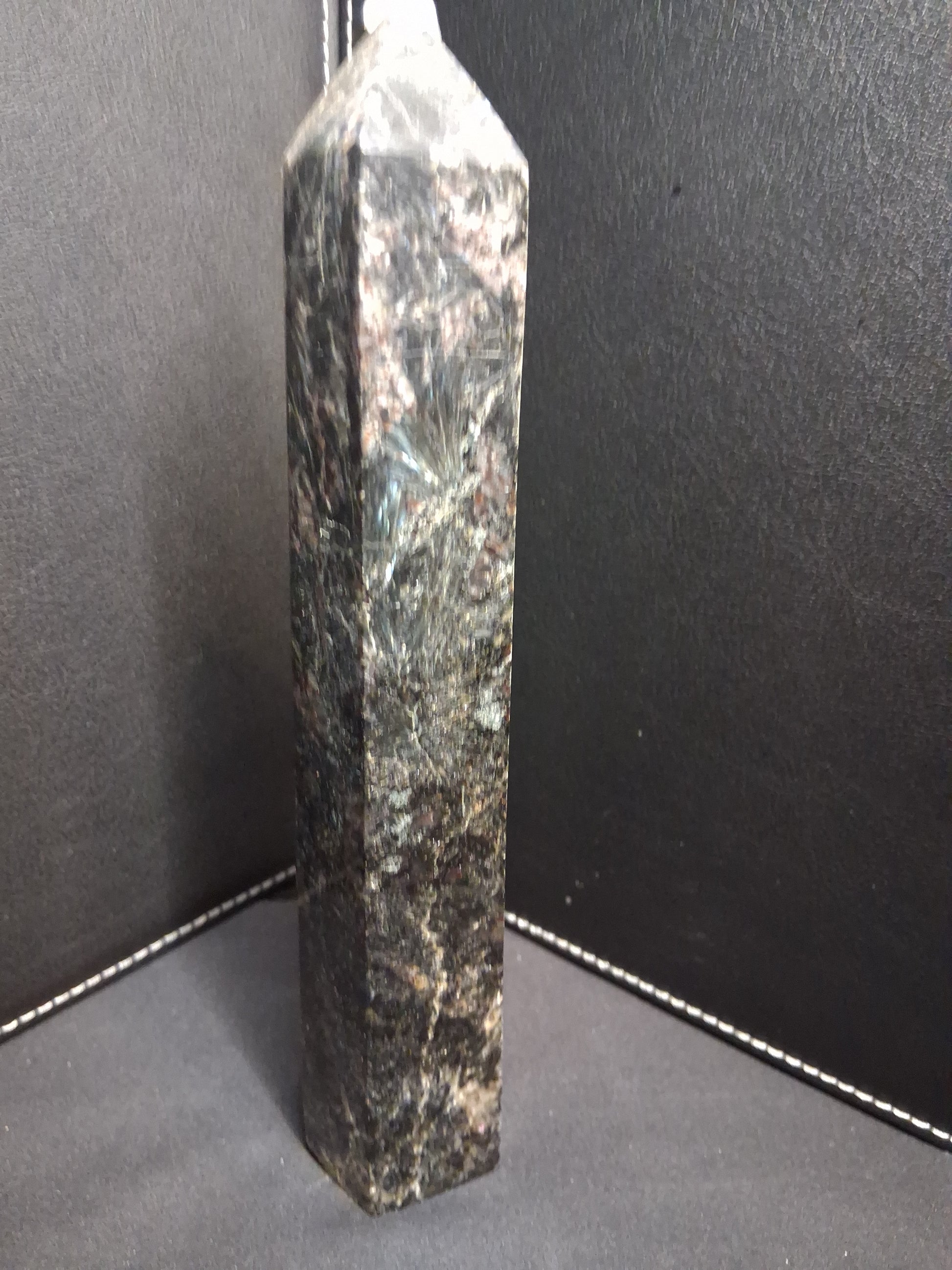 This astrophyllite tower exemplifies why mineral enthusiasts value this very rare titanium silicate—its striking starburst formations and lustrous black-blue surface captivate both seasoned collectors and those drawn to crystal traditions. The specimen's natural formation within host rock creates distinctive patterns unique to each piece. Astrophyllite's reputation extends across collecting communities and spiritual practices, where it's sought for its purported connection to higher consciousness and intuitive insight. A substantial tower ideal for display or contemplative spaces.