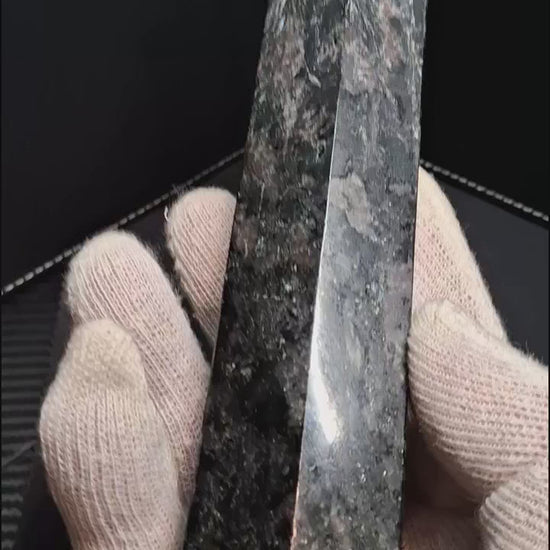 Astrophyllite is a rare titanium silicate mineral prized by collectors for its distinctive black and blue metallic luster. This 195 mm tower showcases the crystal's characteristic needle-like formations and iridescent sheen that shifts across the surface. Known in crystal traditions as a stone of cosmic connection, astrophyllite is believed to enhance intuition and spiritual awareness. The substantial size makes it an impressive display piece for any mineral collection or meditation space. Each tower is naturally formed, ensuring unique patterns and coloration.