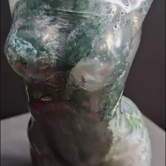 Célébration gracieuse de l'art de la nature, ce torse en agate sculpté à la main capture la beauté sereine de la pierre embrassée par la mousse. La base gris-bleu offre une fondation apaisante, tandis que des inclusions de mousse verte dansent à la surface comme des secrets chuchotés par la terre. Des motifs cristallins scintillent partout, créant un jeu de lumière et d'ombre en constante évolution. Parfaite pour les espaces de méditation, les autels ou comme pièce décorative significative, cette sculpture de 8 cm invite à la contemplation et à la connexion. La forme féminine incarne une énergie nourricière, en faisant un compagnon idéal pour la pratique spirituelle ou une pièce de conversation étonnante pour n'importe quelle pièce. Chaque pièce est unique – un cadeau unique de la nature elle-même.