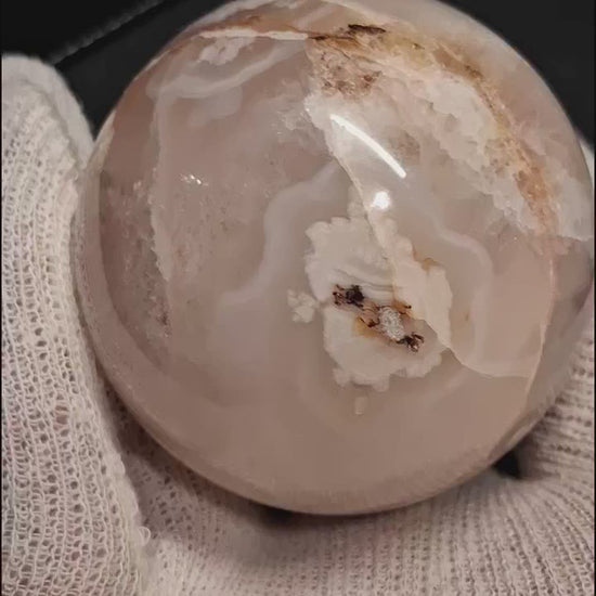 This impressive 6 cm natural agate sphere showcases the refined elegance of Sakura agate, also recognized as flower agate among mineral enthusiasts. The specimen displays a sophisticated palette of warm beige transitioning to pinkish-brown tones, with the characteristic floral-like patterns that define this sought-after variety. The larger size makes it an exceptional display piece, ideal for collectors who appreciate substantial specimens with notable visual impact. Hand-polished to reveal the stone's natural luster and intricate formations, this sphere serves as both a striking decorative element and a meaningful addition to any serious gemstone collection. Its substantial weight and presence make it particularly valued for those seeking premium natural agate specimens.