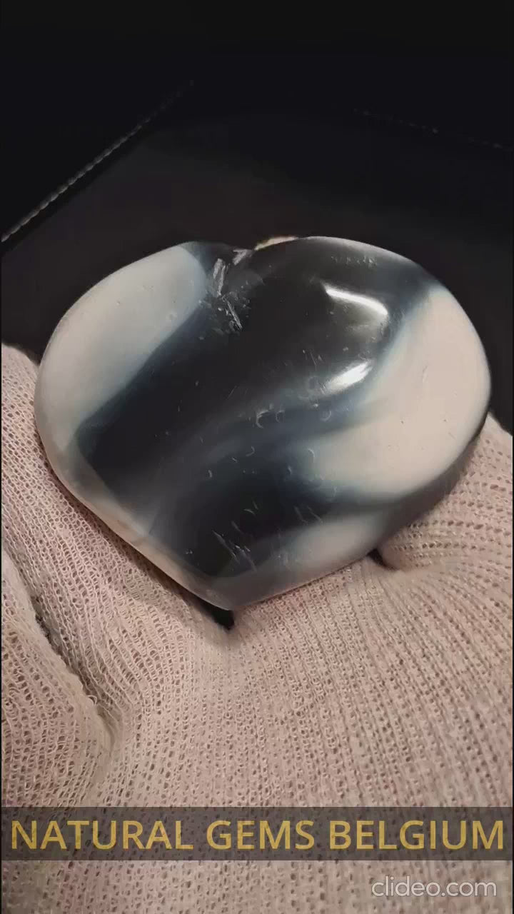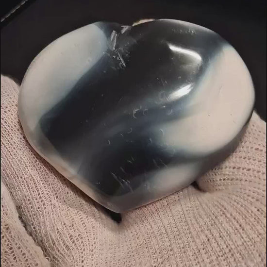 Experience the understated elegance of this black agate palmstone, carved into a graceful heart form measuring 6x7.5 cm. Black agate is valued for its deep, polished finish and subtle banding that catches light with refined sophistication. The smooth contours fit naturally in the palm, making it an excellent choice for grounding practices or as a striking addition to mineral collections. This stone's dense composition and lustrous surface distinguish it from lighter varieties, offering a contemporary aesthetic alongside traditional gemstone appeal. A versatile piece that complements both modern and classic interiors while providing the tactile comfort of authentic natural stone.