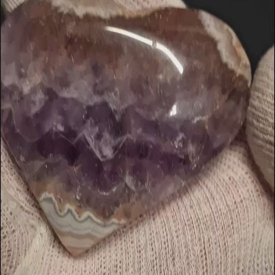 Experience the refined elegance of this heart-shaped amethyst palmstone, with a striking Mexican crazy lace agate point. Hand-sourced from Mexico's premier crystal regions, this dual-mineral composition merges amethyst's renowned calming properties with agate's grounding, stabilizing essence. The smooth palmstone surface welcomes meditative practice, while the distinctive pointed agate accent adds visual intrigue and energetic focus. Ideal for those seeking a versatile piece that transitions seamlessly between personal spiritual work and thoughtful home décor, this authentic natural specimen embodies the raw beauty and mineral diversity of Mexican geology.