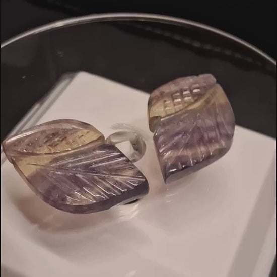 Hand-carved bicolor fluorite leaf pair, meticulously sculpted from natural stone and showcasing striking color banding. At 54 carats, these gemstones offer vibrant hues perfect for pendant or earring designs (ideal for starting wire wrappers). With a Mohs hardness of 4, fluorite is ideal for jewelry pieces that receive gentle, occasional wear rather than daily use.