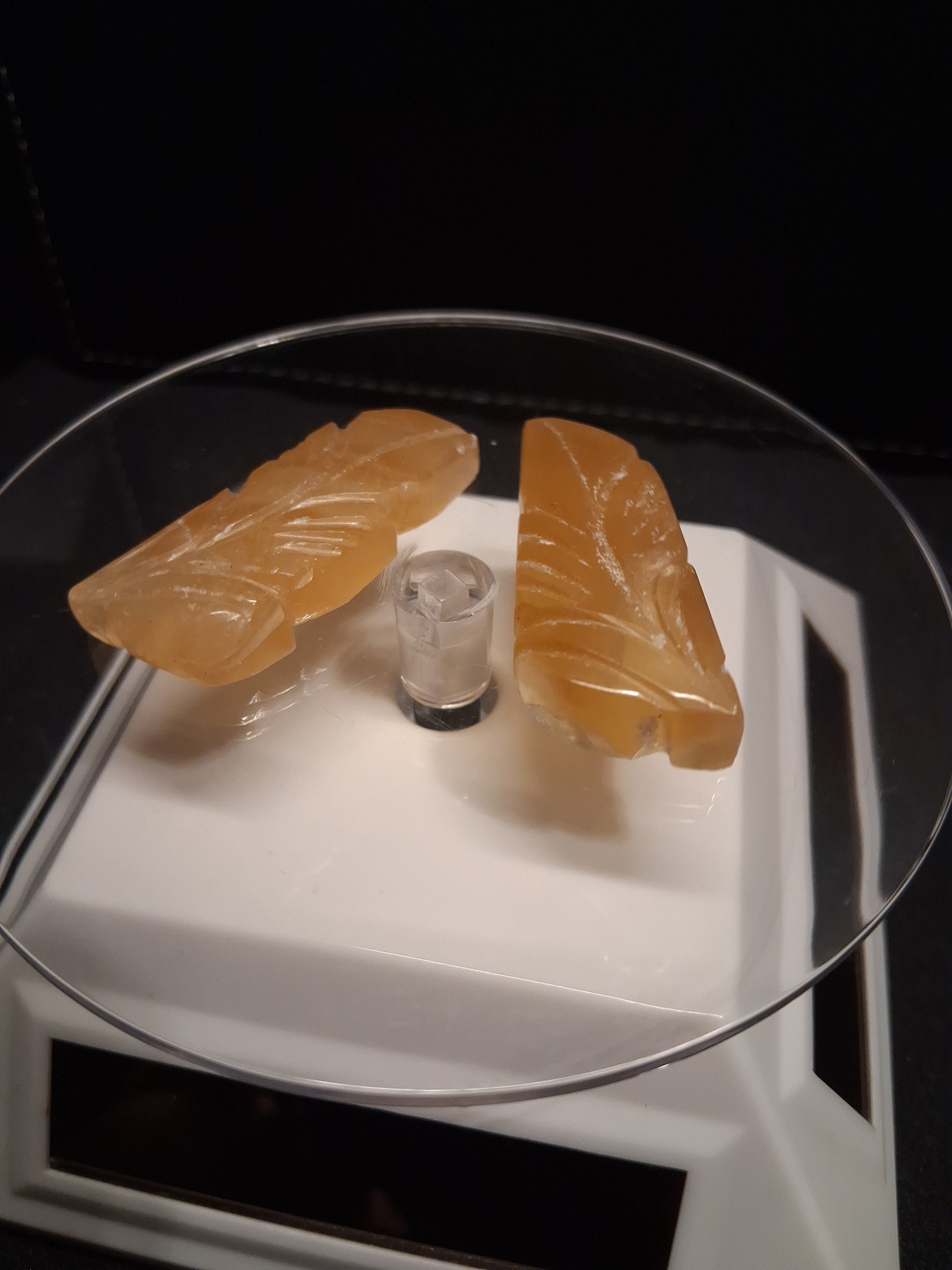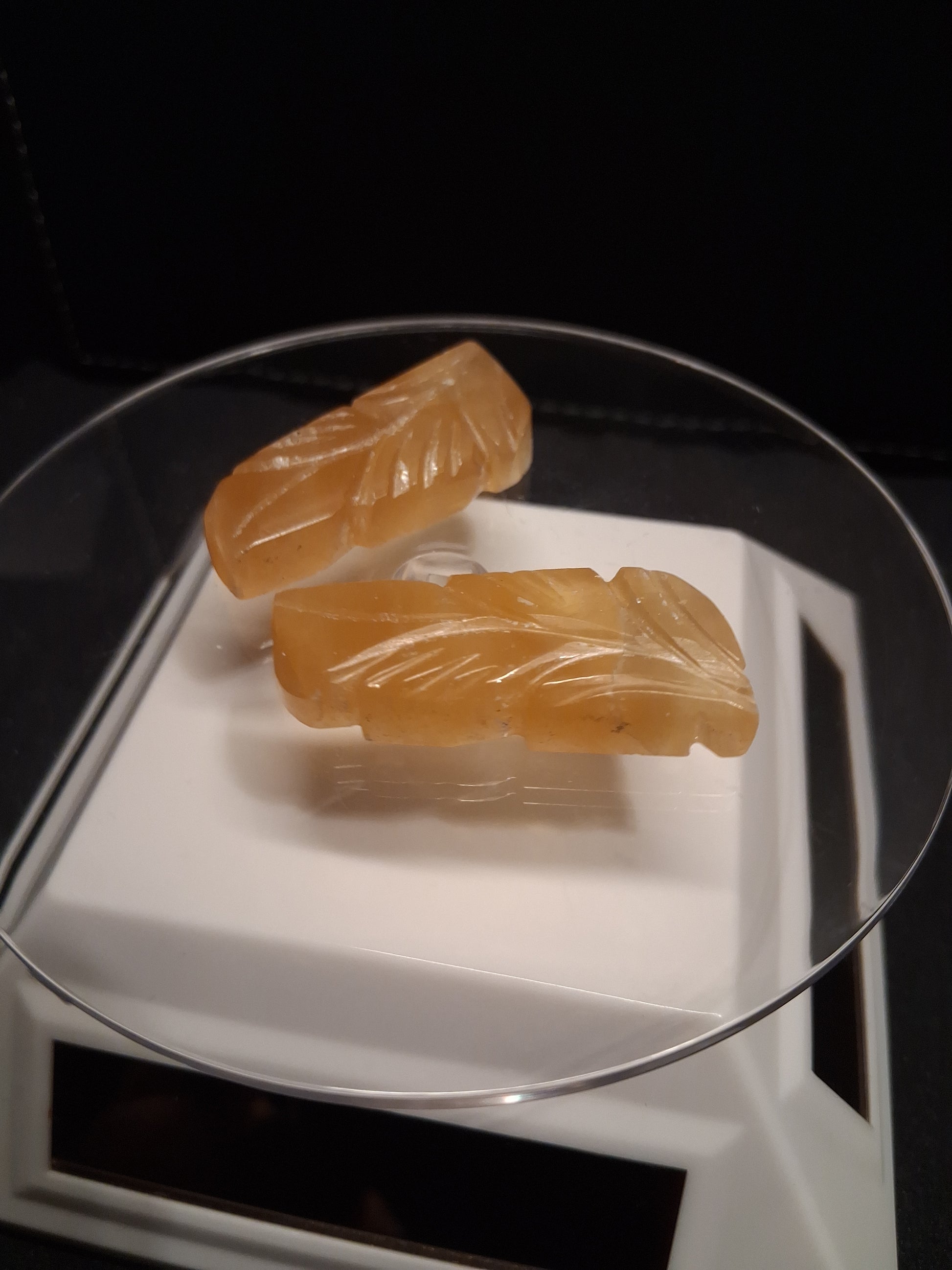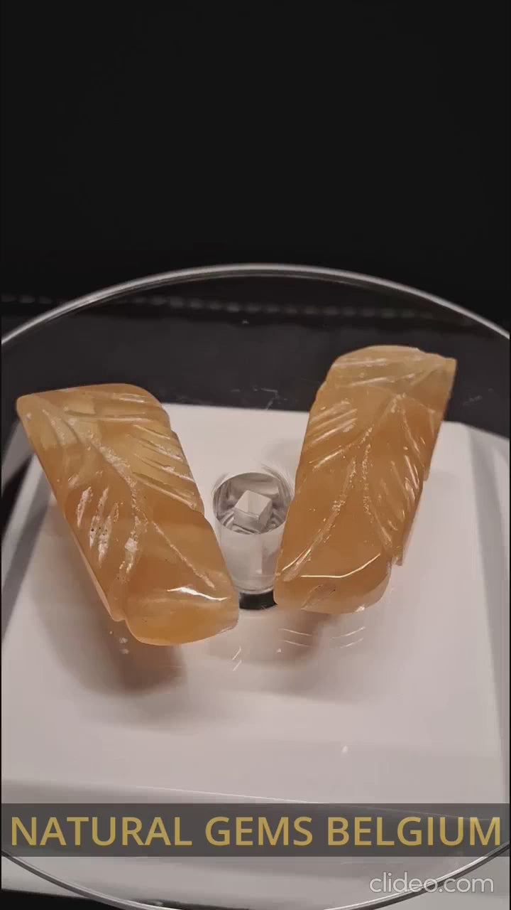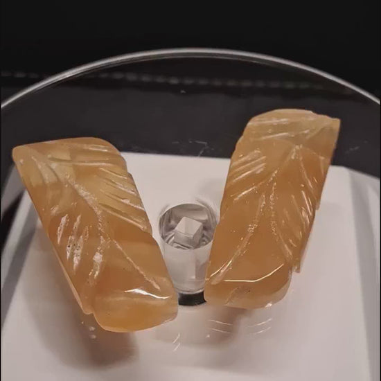Hand-carved orangy yellow fluorite leaf pair, meticulously sculpted from natural stone and showcasing striking color. At 80 carats, these gemstones offer vibrant hues perfect for pendant or earring designs (ideal for starting wire wrappers). With a Mohs hardness of 4, fluorite is ideal for jewelry pieces that receive gentle, occasional wear rather than daily use.