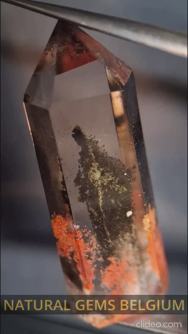 This 4.1 cm hexagonal Phantom Quartz point is a window into geological history, where golden, orange and dark phantoms suspend within transparent quartz layers. The interplay of warm earth tones creates a mesmerizing scenic composition that draws the eye. Perfect for collectors who seek genuine, naturally patterned specimens with undeniable character and visual intrigue.